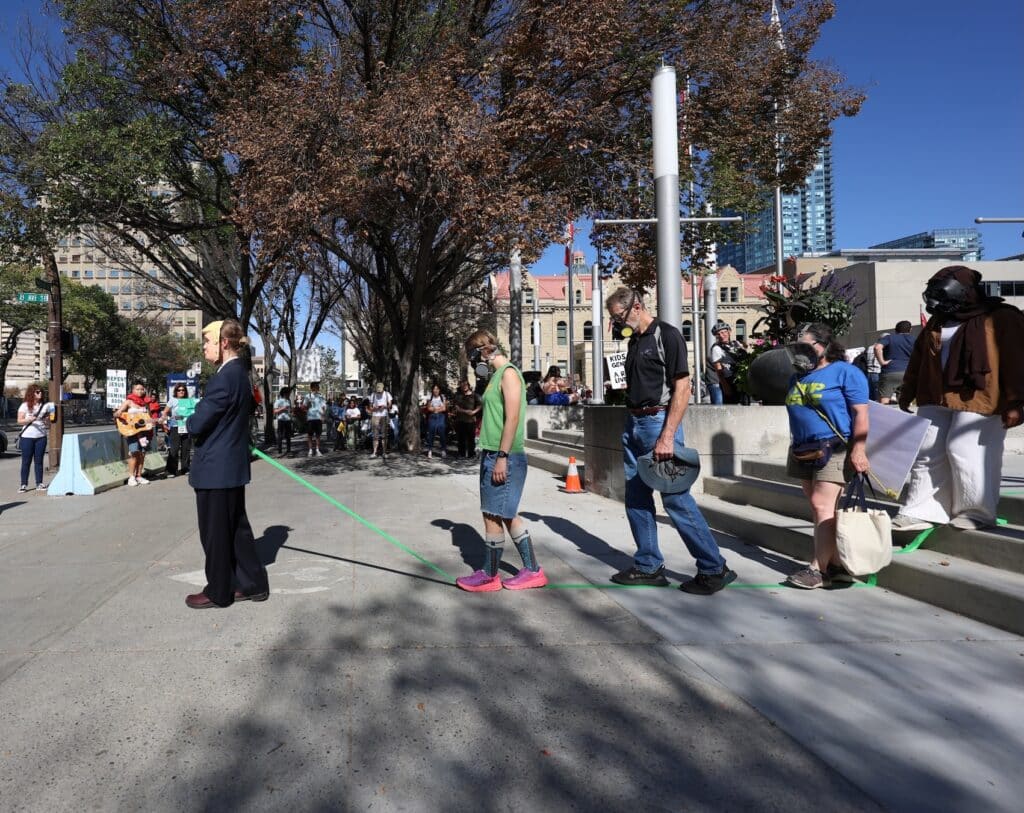 For 2025, TRAction joined the Draw the Line protest to demonstrate the line that oligarchs and authoritarians are drawing between the ‘haves’ and ‘have-nots’. Via the annual Procession for End Times, TRAction – in collaboration with volunteer mourners – offered a funeral march for ACCESS. As the billionaire oligarchy and their authoritarian henchmen concentrate wealth and power in the hands of the few, access to even the most basic necessities, such as clean water, air and food, are being put out of reach. The art action drew a literal line on concrete pavement, demonstrating the line drawn between those with access and those without.